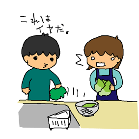 ビンボクサイ石川マンに私が指摘されること。レタスの食べれない部分。私はがもったいなくて食べようとザルに入れてるレタスを石川マンが捨てる。 |