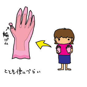 手荒れがひどいので、水仕事はゴム手袋を着用。主要な指先はすぐに穴があいてしまう。もったいないので輪ゴムでしばって水が入ってこないようにして、1週間くらいは根性で使い続けるが、指先が手袋の先まで届かないのでとても使いにくい。 |