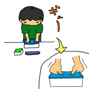 テレビで『弁当箱を真空にすると、傷みにくい』というのをみて、真空専用の弁当箱じゃないのに、がんばって真空にする石川マン。(ふたがカパカパの弁当箱なのに…) |